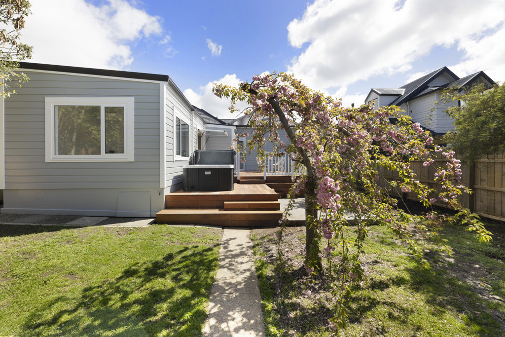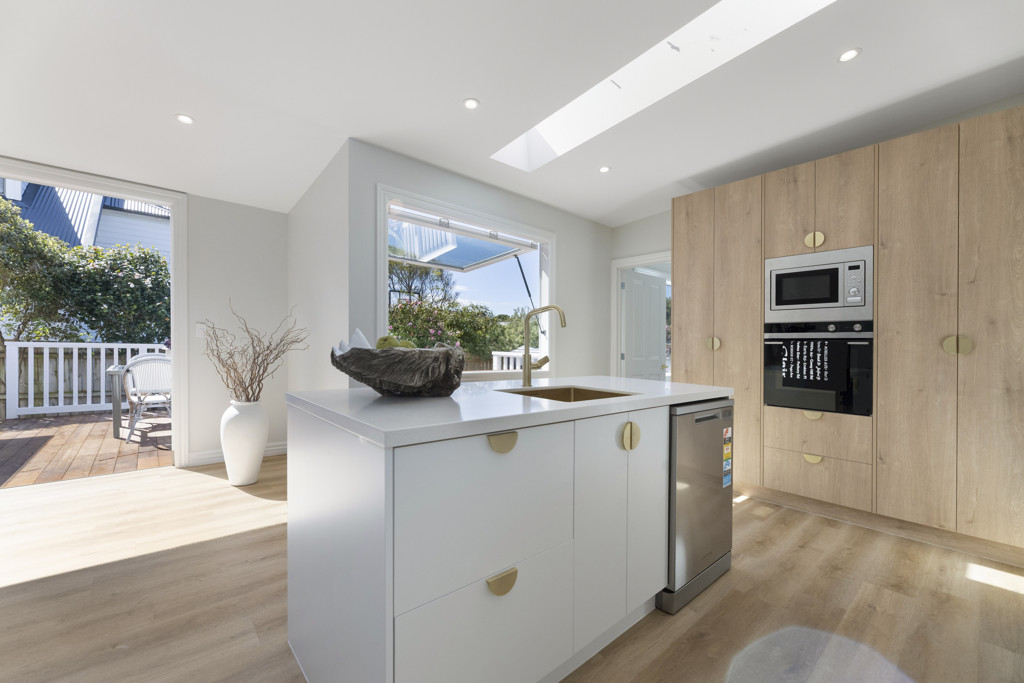 Inside, the light-filled open-plan living area connects seamlessly to a brand-new designer kitchen with stone benchtops, quality appliances, and warm timber tones. Large sliding doors open to a sun-soaked Kwila deck and landscaped garden, providing an easy indoor-outdoor flow perfect for entertaining or relaxing.