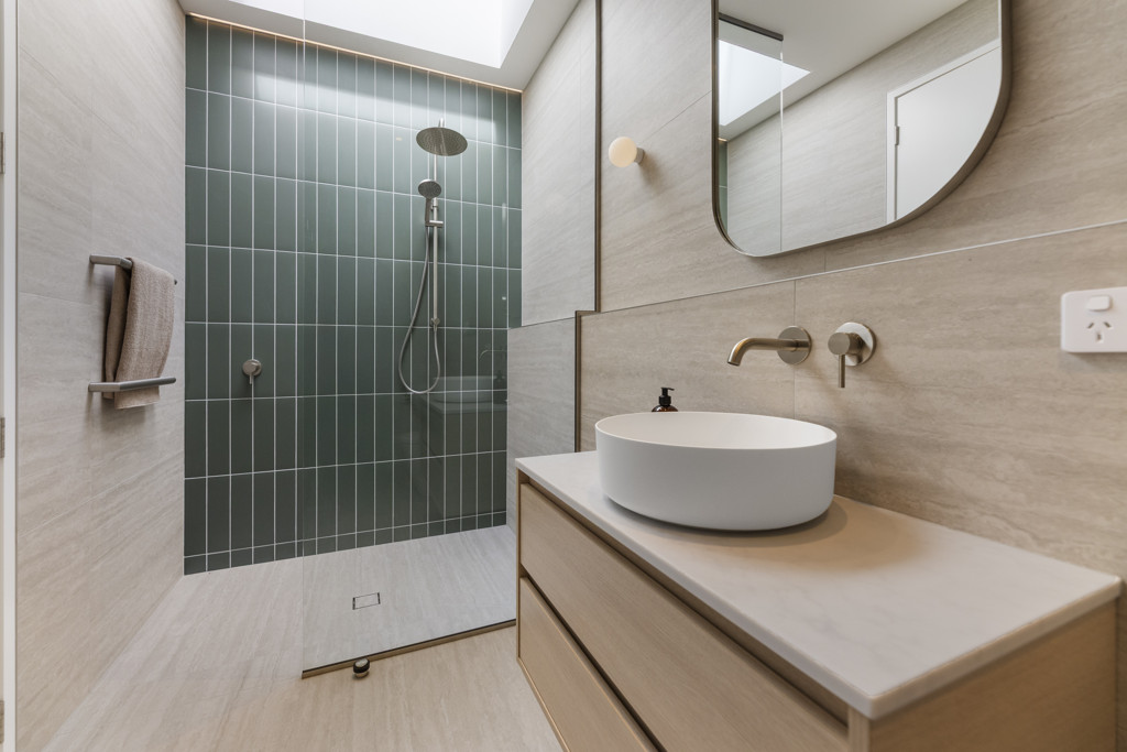 Floor to ceiling 'travertine' tiled bathrooms with luxurious underfloor heating