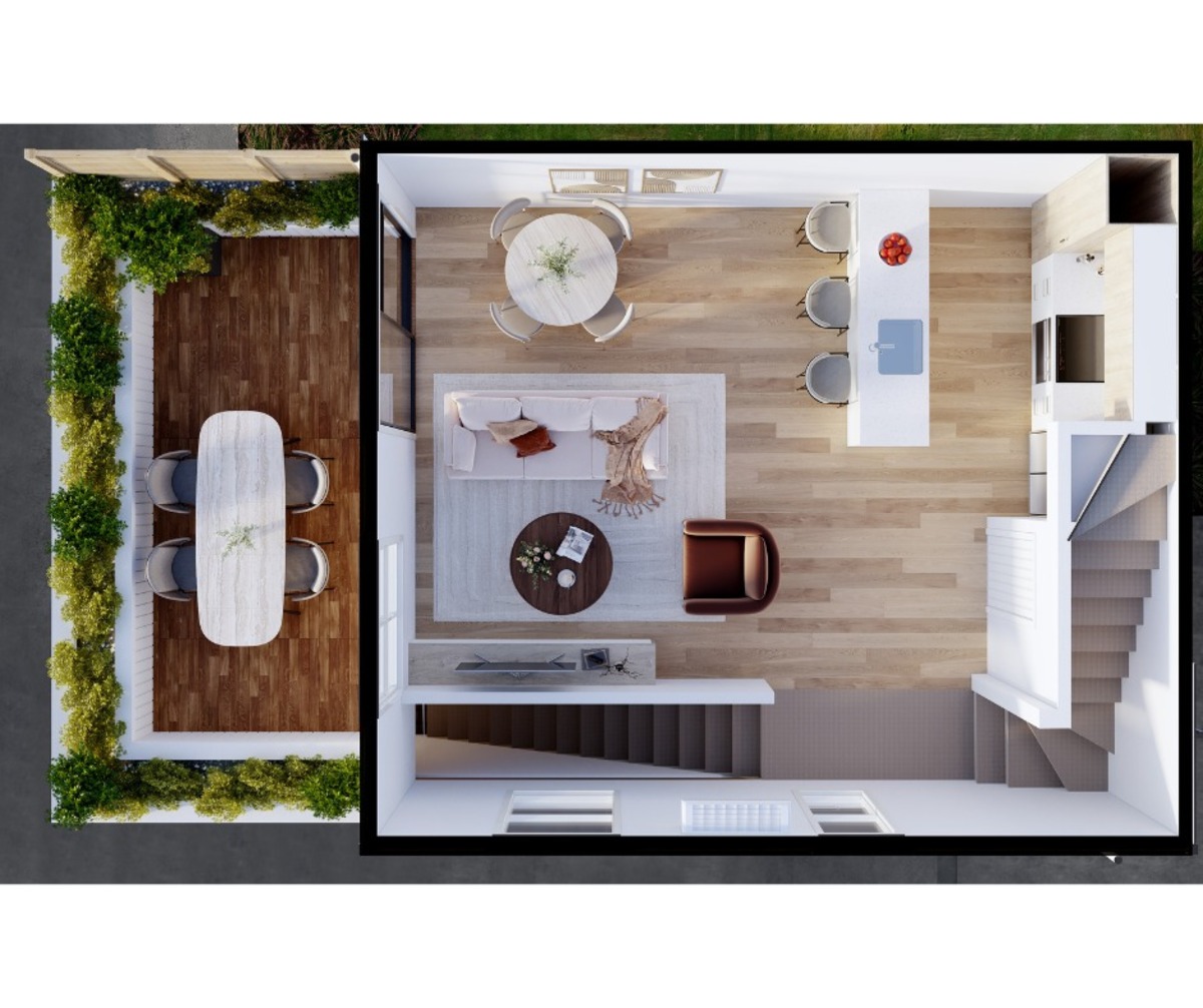 Upstairs on the first floor, an open-plan kitchen, dining, and living area opens out onto a northern-facing deck.