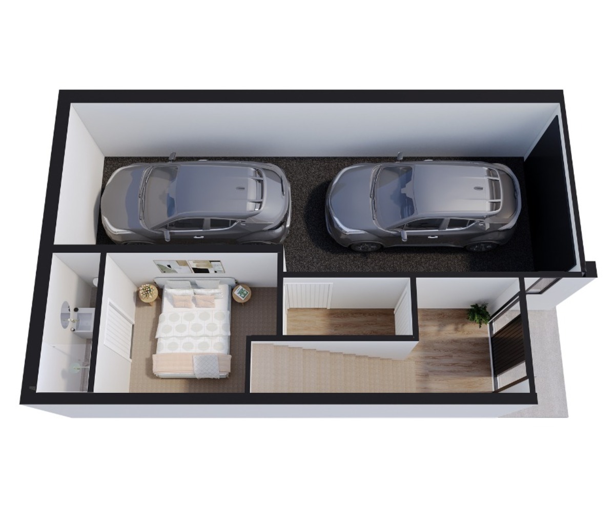 On the ground floor, drive into the internal access garage, which has space for two cars nose-to-tail. This level also contains a double bedroom with an ensuite and built-in wardrobes. The laundry is also located on this floor.