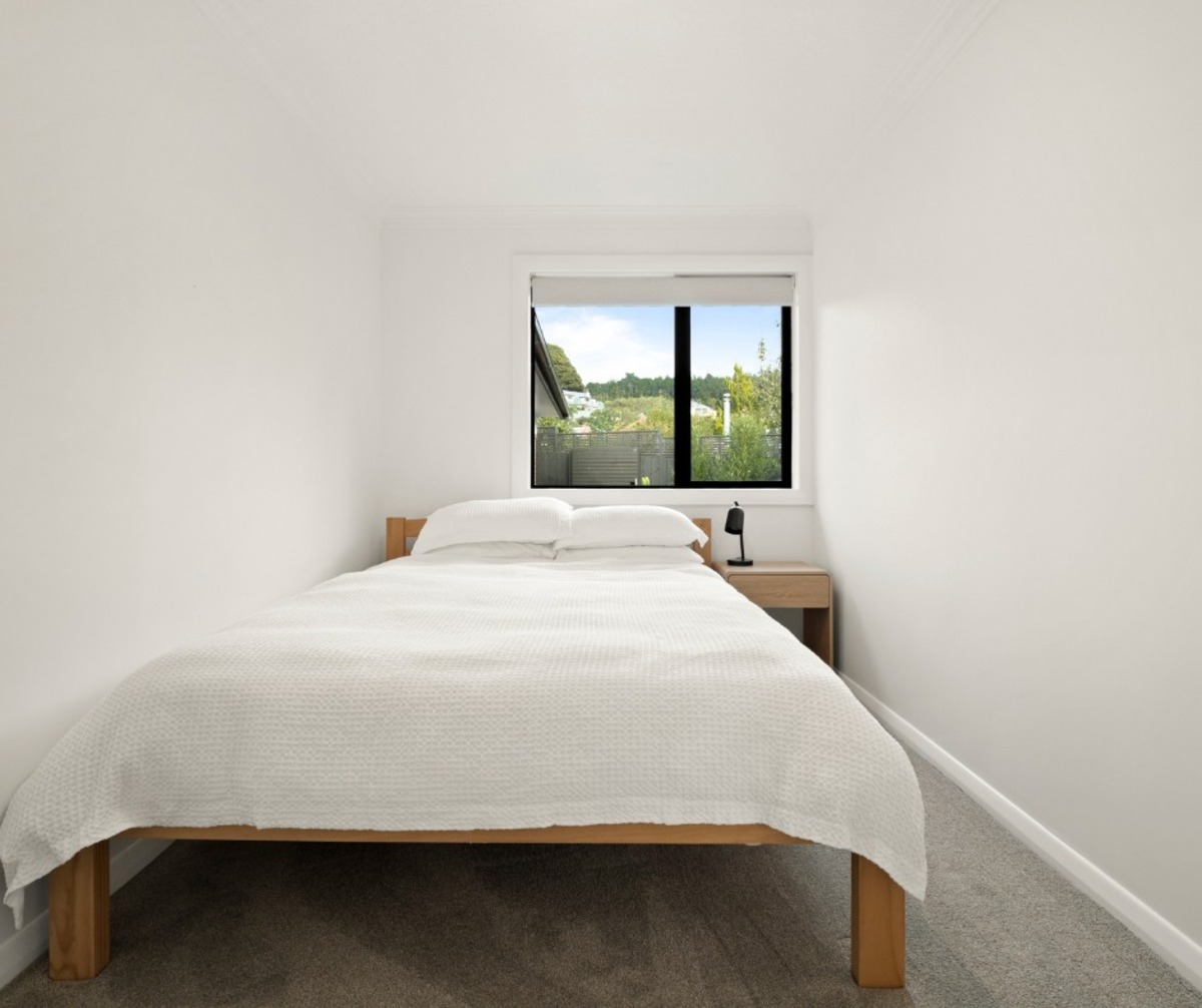 Each bedroom captures gorgeous leafy views, with the primary bedroom featuring a built-in wardrobe and direct access to the deck. The sleek, modern bathroom features both a bath and a shower, along with a separate toilet for added convenience.