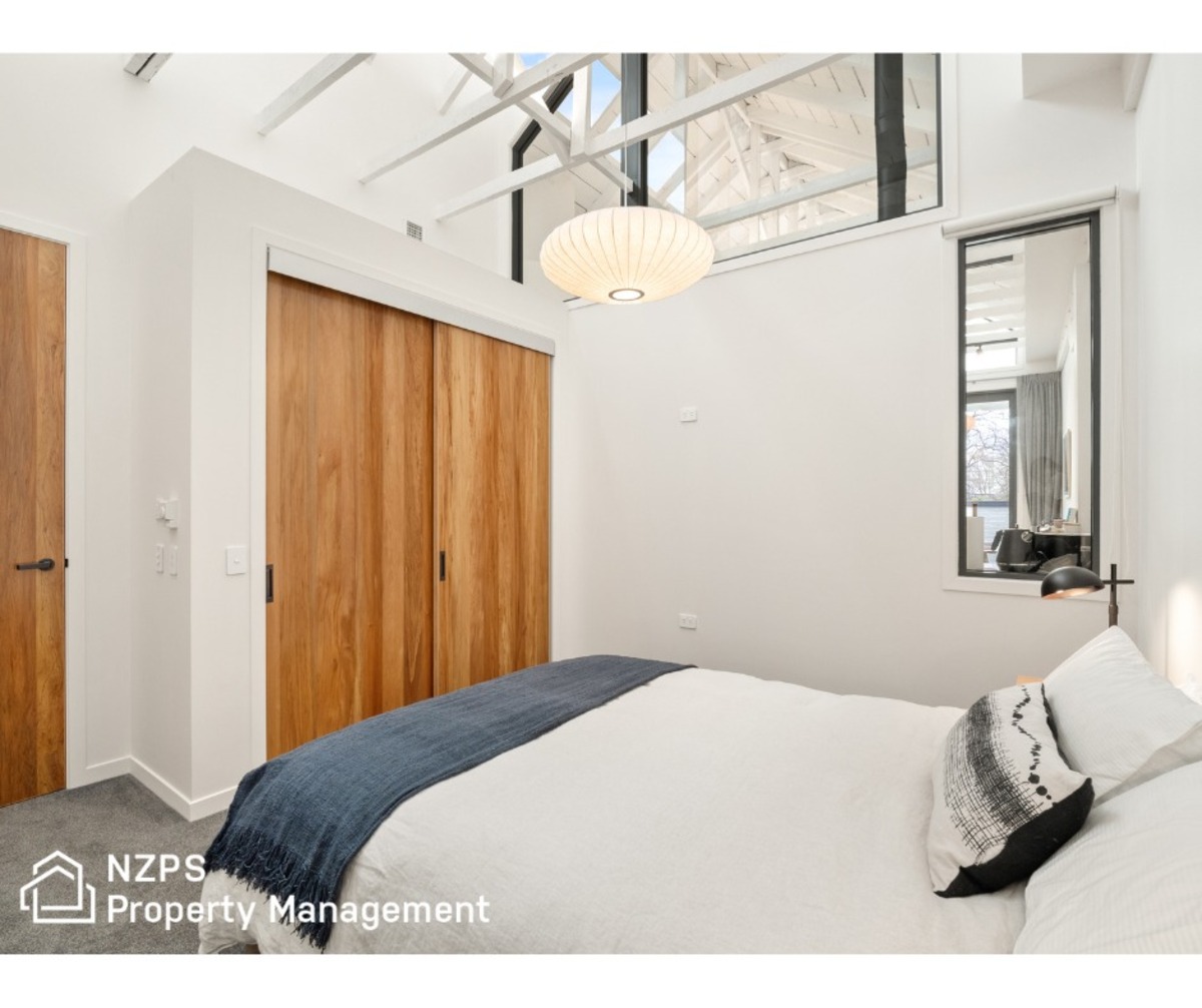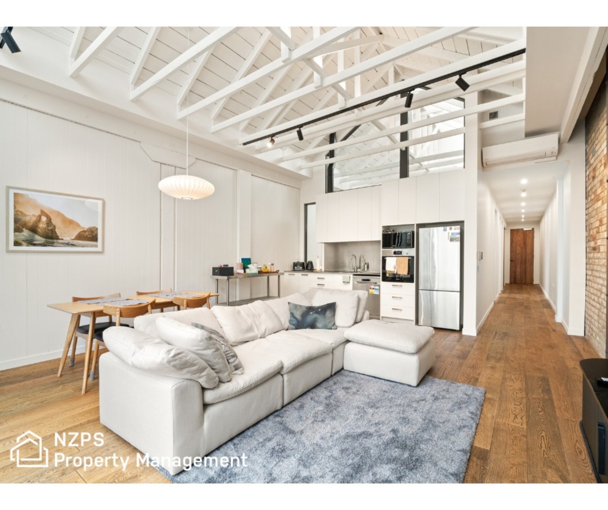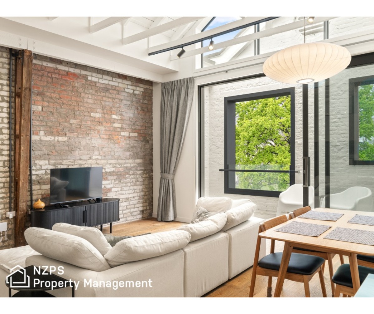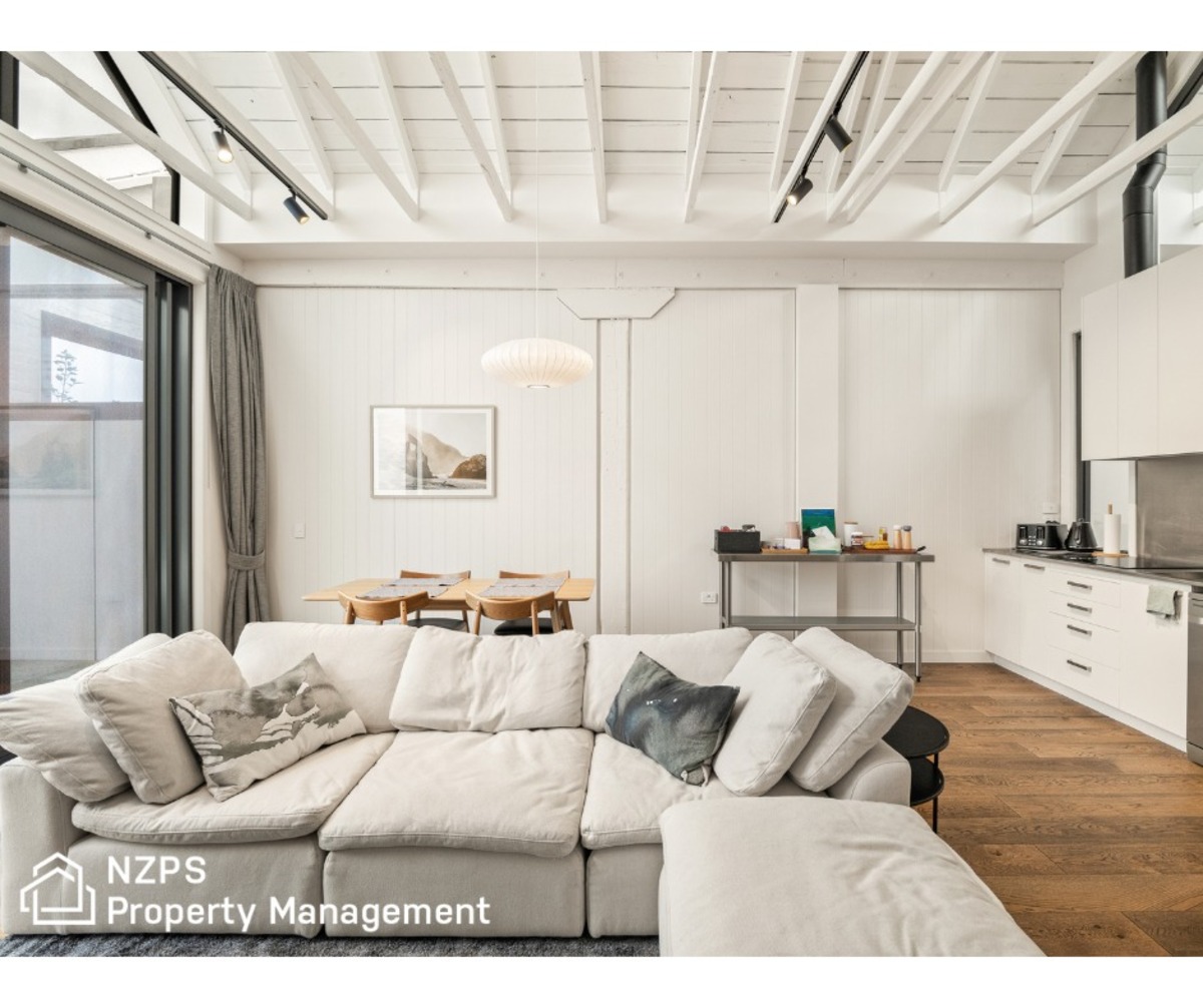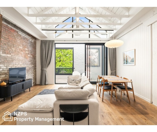 Stunning high vaulted ceilings with exposed wooden beams flow through the apartment, adding a lofty, spacious vibe. Beautifully crafted oversized solid rimu doors, whitewashed exposed brick, tongue, and groove walls add sophisticated rustic charm.