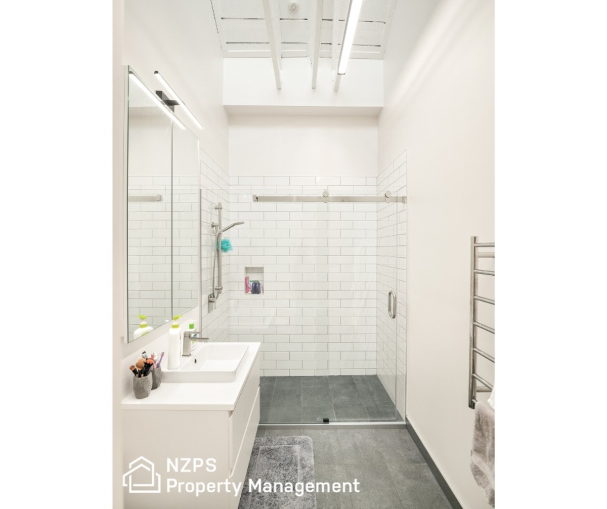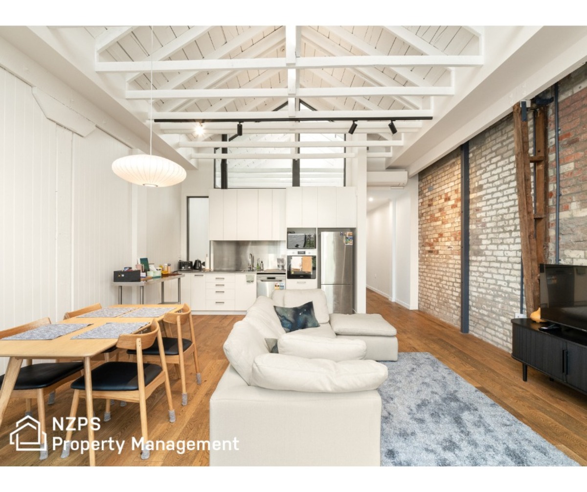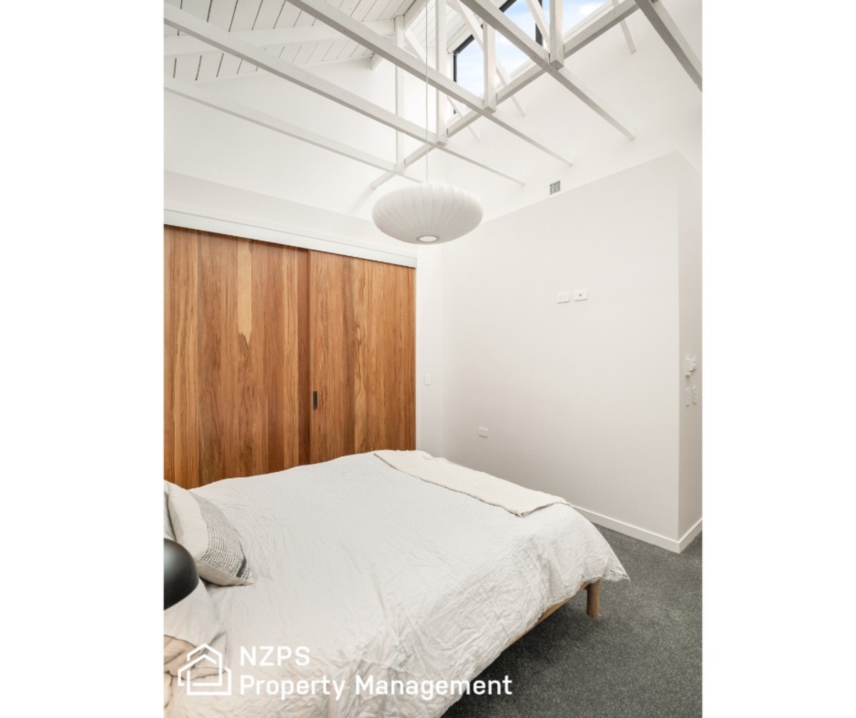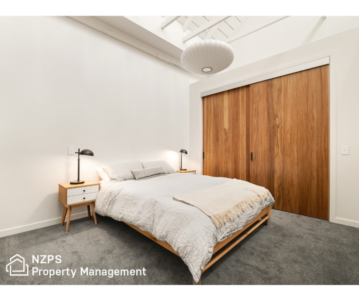 Stunning high vaulted ceilings with exposed wooden beams flow through the apartment, adding a lofty, spacious vibe. Beautifully crafted oversized solid rimu doors, whitewashed exposed brick, tongue, and groove walls add sophisticated rustic charm.