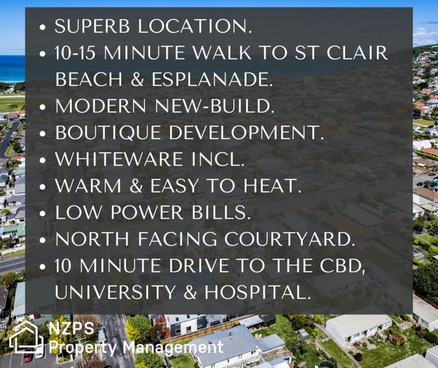 NZPS Property Management is pleased to present this brand-new, high-quality boutique townhouse development in the heart of Saint Clair, Dunedin's most sought-after suburb.