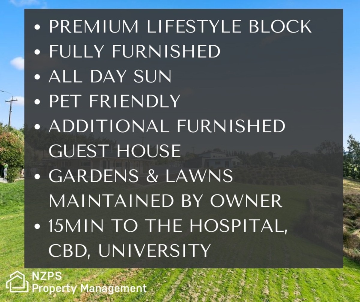 NZPS Property Management is pleased to present a fully furnished premium property on a unique lifestyle block, only 15 minutes from the city centre, with a separate guest house.The main house is split-level. On the ground level, it has an open-plan kitchen, dining, and living area and a spacious primary bedroom with a walk-in wardrobe, ensuite, and sliding door access to its private deck. The living space also features an office nook, a large wood-burning stove, and a huge wall-mounted Smart TV. The laundry is located in the carpeted, double-internal-access garage. On the spacious second level are three double bedrooms with built-in wardrobes, a family-sized bathroom with a shower, a separate bath, and a separate toilet for added convenience.